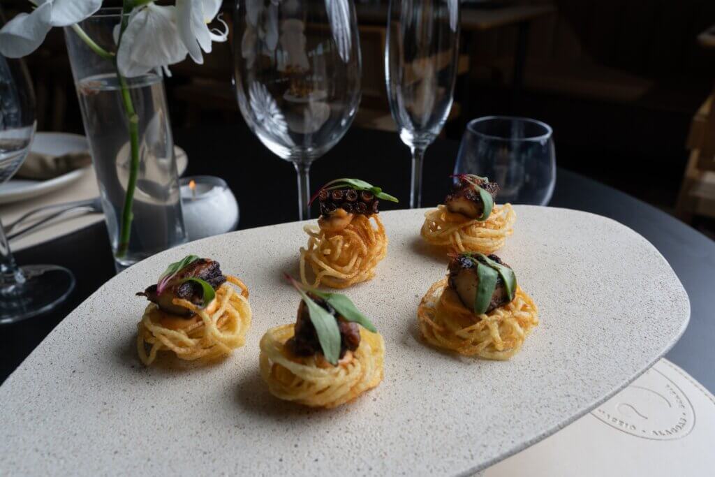 “Para o Flor de Sal, quis trazer pratos que fizessem parte da minha história. Entre eles, o Arroz de Polvo dos Milagres, o mais pedido no Réveillon em São Miguel dos Milagres, e a Cocada de colher com sorvete de tapioca, presença constante nos casamentos da região. Além deles, servimos pratos clássicos, como o mignon de carne de Sol com queijo coalho, croqueta de siri, ninho crocante de batatas com carne de sol, polvo laqueado com mel de engenho e o bobó de camarão”, explica Wanderson Medeiros.