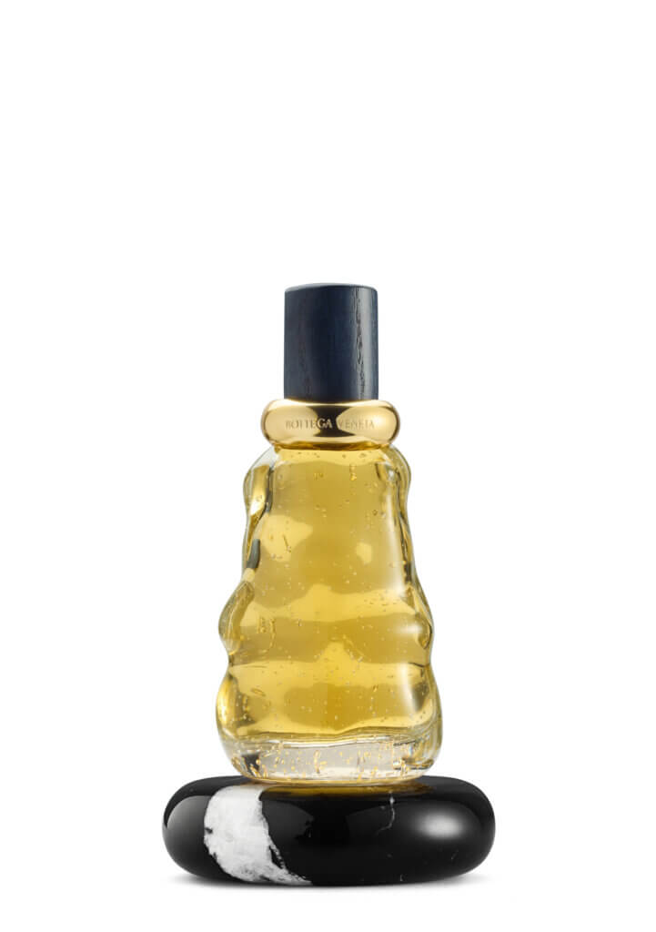 True to the house’s roots, the bottle design is inspired by the craft and materials of Venice. The volute bottle plays tribute to the centuries-long tradition of Murano glassblowing, replicating the effect of mouth-blown glass, while the marble base evokes the walls, floors, and facades of Venetian churches and palazzi.