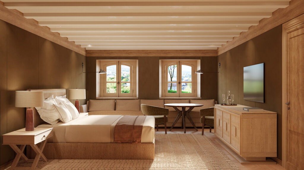 Instalado em um antigo castelo restaurado com elegância e riqueza de detalhes, o hotel combina arquitetura, história e design contemporâneo em uma atmosfera de tranquilidade e bem-estar. É o refúgio ideal para quem busca conforto, privacidade e contato genuíno com a cultura e a natureza da região.