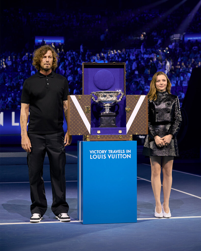 Chloë Grace Moretz presents the emblematic Norman Brookes Challenge Cup trophy in its Louis Vuitton Trophy Trunk, together with Marat Safin.