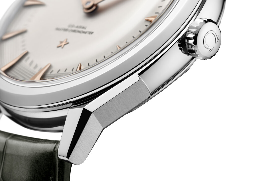 A coleção OMEGA Constellation Observatory reinterpreta os códigos estéticos definidores da marca. Sua linguagem de design remonta ao Centenary de 1948, que lançou as bases para o Constellation. O mostrador pie-pan dodecagonal surgiu logo após o lançamento do primeiro Constellation, com a estrela Constellation às 6 horas e o medalhão do Observatório no fundo da caixa. O acabamento guilloché aparece nas facetas do mostrador, um detalhe introduzido nos primeiros modelos Grand Luxe. Os índices facetados em formato de “pipa” e os ponteiros dauphine inspiram-se em modelos históricos, assim como as garras “dog-leg”. A pulseira de malha em ouro Moonshine™ 18K com padrão de tijolos de nove fileiras remonta às pulseiras vintage dos anos de formação da linha.