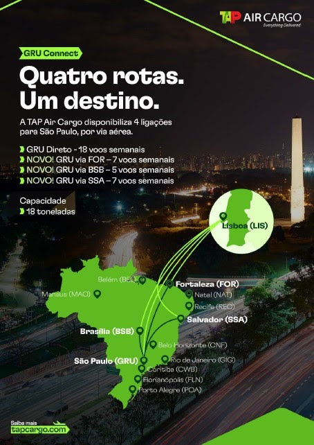 Ao GRU Direto, entre Lisboa e São Paulo, e às opções Via Fortaleza e Via Brasília, este serviço acrescenta agora a rota Via Salvador com sete voos semanais para o transporte air-air até Guarulhos, num produto flexível, confiável e competitivo e que responde ao crescimento do comércio entre Europa e Brasil.