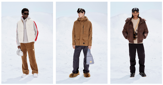 A coleção é criada com savoir-faire e expertise do universo do esporte. Desenvolvidas para performance, as peças são confeccionadas com materiais impermeáveis e com detalhes de ventilação, fechamento à prova d’água, compartimento isolado para carregar itens, além de sistemas integrados BOA para botas e ganchos de snowboard. Um macacão de ski com o padrão LV Tartan Pixel combina o estilo das altitudes com a herança que simboliza o espírito dandy. Outro macacão de ski é apresentado com a assinatura LV aplicada em um material que faz alusão ao denim, característico do dia a dia dandy. Uma jaqueta impermeável construída seguindo os princípios do ski, é reinterpretada como uma jaqueta casual em veludo bege.