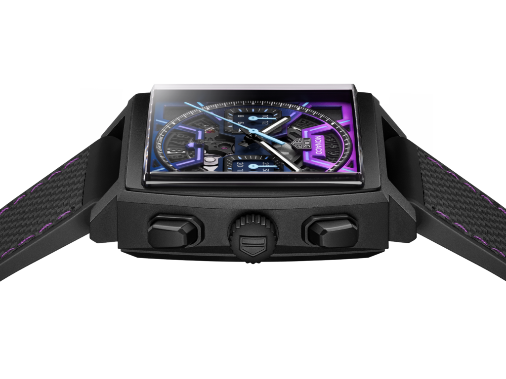 Completando a peça, uma pulseira que combina borracha preta e couro em relevo, com pespontos roxos que harmonizam com a paleta de cores do mostrador. Cada peça desta nova edição limitada é numerada individualmente, sendo uma de apenas 600 unidades produzidas. Ela vem em uma embalagem exclusiva TAG Heuer Monaco com detalhes roxos.