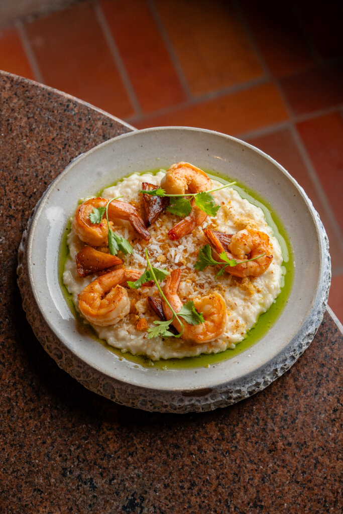 Modo de preparo: o risoto é preparado com leite de coco, garantindo cremosidade. Os camarões são grelhados separadamente. O prato é finalizado com abacaxi caramelizado, farofa de camarão seco e coentro fresco.